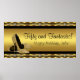 Calçados de salto alto, preto e dourado muito grandes, mulheres, banner de festas de aniversário. Você pode personalizar esta faixa elegante de calçado de alto salto em ouro com sua escolha de texto no estilo de fonte e na cor de sua escolha.