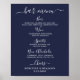 Menu do Bar ! Caligrafia simples e elegante, este letreiro de barra de bebidas de casamento apresenta quatro bebidas 'Cerveja', 'Vinho', 'Destilados' e 'Não Alcoólico', personalizado com suas bebidas de escolha. Personalize este letreiro de casamento elegante com seus nomes e menu de bebidas do bar de casamento! COPYRIGHT © 2020 Judy Burrows, Black Dog Art - Todos os Direitos Reservados. Poster de Menu de Bebidas Azul-Marinho Personalizado Bar de Casamento