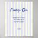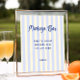 Sinal de bar mimosa do chá de panela temático mediterrânico branco apresentando uma paleta de cor macia e convidativa de nádegas e listras azuis macios. Este pano de fundo tranquilo é perfeitamente complementado pela divertida fonte azul escura escrita à mão, criando uma mistura harmoniosa de cores.