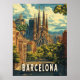 Poster de viagens vibrante e colorido mostrando a icônica Sagrada Família em Barcelona. Projetado em um estilo de arte vetorial plano com tons pastéis e blocos coloridos em negrito. Perfeito para entusiastas de decoração doméstica ou viagem.