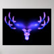 Uma imagem fractal neonatal, roxa e azul parecida com a cabeça de um animal aninhado sobre um fundo escuro.