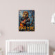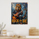 Esta trabalho de arte impressionante apresenta um leão legal, óculos de sol esportivos e uma jaqueta de couro, tocando intensamente um violão elétrico enquanto tocava nos ramos roçados de uma árvore nua. Um céu azul e branco texturizado forma o pano de fundo. As pinceladas grossas e expressivas da pintura dão uma energia dinâmica e bruta à cena, transmitindo perfeitamente o espírito "Rock or Die".