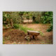 Um vagão/carrinho de rodas ao lado de morro e pá de estrume, debaixo de oliveiras.
