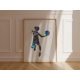 Vibrant watercolor-style artwork depicting a teenage boy playing basketball. The dynamic pose and colorful splashes capture the energy and motion of the sport. This athletic poster design highlights youthful enthusiasm and makes an eye-catching addition to sports-themed wall decor.