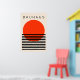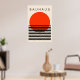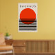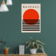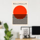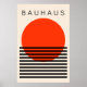 Um design de arte moderna no estilo Bauhaus de um sol vermelho laranja com linhas horizontais pretas sobre um fundo bege.
