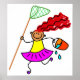 Um belo desenho animado de uma garotinha na praia com sua rede de pesca e balde de água pronta para colocar suas criaturas marinhas.