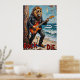 Esta pintura cativante apresenta um leão, cheio de óculos de sol e uma jaqueta de couro, profundamente mergulhado em um "blues de praia" em um violão elétrico. Ele está se inclinando contra um posto de madeira meteorizada em uma costa arenosa, com um mar azul texturizado e ondas de capas brancas. O vibrante, incapaz de escovar cria uma atmosfera viva e entusiasmante, transmitindo perfeitamente a vibração "Rock or Die" deste concerto único ao ar livre