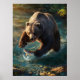 Um urso majestoso está captando habilmente um peixe em uma região de rio sereno. Os ursos, poderoso movimento e foco intenso são capturados nesta pintura dinâmica.