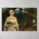 “Beatrice” by John William Waterhouse presents a quiet, lyrical moment in a sun-dappled woodland. A young woman in a white, softly patterned gown and hooded veil stands in profile, her gaze turned outward as if listening for something just beyond the trees. She cradles a small bouquet of vivid flowers, their reds and blues popping against the pale fabric and drawing your eye to her calm, thoughtful expression.
