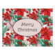 Watercolor Christmas design of red and white poinsettias, pine branches, hollies and red berries.