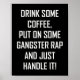 "BEBA ALGUM CAFÉ, COLOQUE ALGUM RAP DE GANGSTER E APENAS TRABALHE!", por Design de Gráfico de Negócios Macacos.