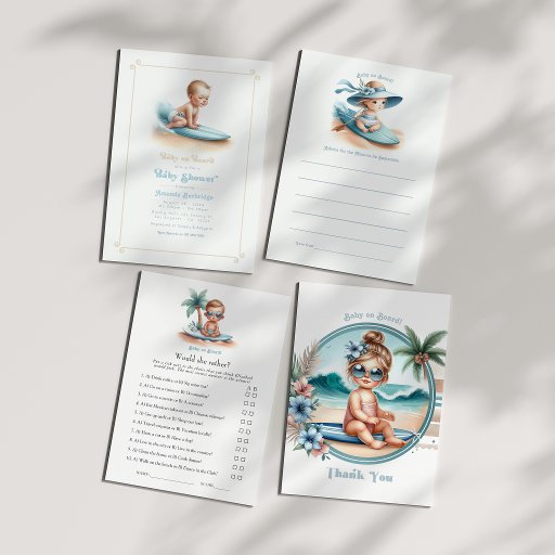 Dê as boas-vindas aos convidados na sua festa de bebê à beira-mar com este adorável pôster de boas-vindas com tema de surfe Baby on Board! Com uma linda criança na praia ao lado de uma prancha de surfe na areia dourada macia, este design captura as vibrações arejadas e descontraídas de uma celebração costeira. Com azuis oceânicos, neutros arenosos e verde tropical, este pôster cria a cena perfeita para uma festa de bebê com tema náutico, surfe ou verão. Personalize com o nome da convidada de honra e os detalhes do evento para uma entrada perfeita!