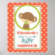 Um chá de fraldas fofo personalizado com um doce macaco bebê com pacificador na boca. O fundo é um padrão de bolinhas laranja e branca.