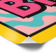 Explosion graphique autour d’une canette de bière stylisée en formes cartoon. L’affiche regorge de motifs typiques du Memphis : zigzags fuchsia, triangles cyan, pois noirs et courbes ondulées jaunes. La canette est au centre, dans une teinte bleu vif, surmontée d’une mousse exagérément pétillante représentée par un nuage blanc avec contours en pointillés. Des bulles multicolores flottent autour, comme des éléments de soda pop, et l’arrière-plan alterne entre damier pastel et bandes ondulantes. Le mot "Bubble Brew!" est écrit en lettres XXL, typographie chunky avec ombres portées.