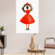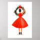 Esta elegante design apresenta uma mulher com um vestido vermelho festivo, segurando uma bela coroa de férias decorada com um grande arco vermelho e verde de inverno. Perfeito para adicionar um toque de charme e estilo de férias vintage a qualquer produto!