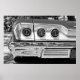 Fotografia monocromática de alta definição das luzes da cauda esquerda de um carro clássico americano.