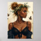 Uma jovem atordoante adornada com uma delicada coroa floral escerá à distância, cercada por borboletas ouros. Sua elegante roupa preta contrasta lindamente com sua pele brilhante, evocando uma sensação de graça natural e mistério. Os tons quentes e suaves do fundo aumentam a atmosfera sonhadora e encantadora.