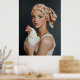 Uma jovem com olhos azuis e traços delicados brilham suavemente enquanto segura uma galinha branca. Ela veste um véu floral amarrado em sua cabeça, evocando uma estética rústica e vintage. O fundo escuro contrasta com a sua pele justa e com as penas brancas do frango, criando um retrato clássico eterno com efeito pareado.