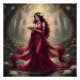 Uma bela fada vestindo um vestido vermelho e uma joia que fluem de rubis com lírios d'água em seu longo cabelo vermelho e asas tipo libra vermelha segurando um lírio d'água fica em um lago superficial em uma floresta mágica cercada de lírios d'água, almofadas de lírios, flores rosa e árvores cobertas de cipós.