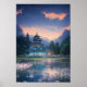 Um templo japonês tradicional de madeira com paredes azuis está na margem de um lago sereno. O templo é rodeado por uma floresta verde esmagadora, aumentando a tranquilidade do cenário. Atrás do templo, a floresta verde fornece um pano de fundo pacífico para a cena tranquila.
