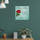Bem-vindo ao nosso cartaz de casamento com um charme elegante e vintage do velho mundo. Uma ilustração de uma rosa vermelha aberta e florescendo com o caule visível e cercada por folhagem verde. Fundo verde suave. Personalize com seus próprios detalhes.