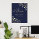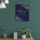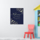 Elegante e atemporal, este sinal de boas-vindas de casamento em azul-marinho e dourado apresenta ilustrações florais românticas desenhadas à mão em folha de ouro falso. A caligrafia moderna adiciona um toque sofisticado, tornando-o perfeito para casamentos formais ou noturnos. Personalize com os nomes dos noivos e a data do casamento para receber seus convidados com estilo.