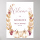 Placa de boas-vindas para chá de noiva com tema de outono em tons de roxo, dourado e natural, apresentando duas abóboras e uma grinalda de tons naturais, roxo e dourado falso. Este design é ideal para quem procura uma placa de boas-vindas para chá de noiva de outono em tons naturais e roxo.