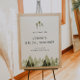 Este sinal de boas-vindas para chá de noiva apresenta árvores de pinheiro em aquarela rústica e uma fonte manuscrita boêmia. Este sinal de boas-vindas tem texto totalmente editável e é perfeito para o seu evento temático de montanha ou floresta.