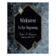Um moderno poster de casamento geométrico preto e dourado e prata com as palavras "Bem-vindos ao nosso começo" juntamente com os nomes da noiva e do noivo e a data do seu casamento.
