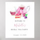 Cartaz de boas-vindas para chá de noiva com ilustração de conjunto de chá fofo. Se precisar de ajuda com qualquer um dos meus designs, por favor, envie uma mensagem para a designer, Kristine Lee, aqui na Zazzle. Desenhado e ilustrado por Kristine Lee Designs www.kristineleedesigns.com