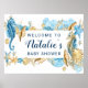 Placa de boas-vindas para Chá de Bebê Sob o Mar Azul e Dourado (cartaz) com cavalos-marinhos, estrelas-do-mar, conchas e recifes de coral com caligrafia moderna. Para personalização avançada deste design, clique no botão "Personalizar" acima! Itens combinando também estão disponíveis.