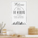 Saudações aos bons que viajaram de perto e longe para vir à sua cerimônia de casamento com esta adorável poster! É certo colocar um sorriso no rosto enquanto eles caminham na igreja, salão de baile, ou locais de sua cerimônia, e servem como uma apreciação da sua presença. O poster de boas-vindas ao casamento, ao estilo deco moderno e divertido, é adaptado especificamente a um casamento que acontece na bela cidade de Houston, Texas. Apresenta uma grande saudação de boas-vindas em direção ao topo e uma ilustração estilizada do horizonte único da cidade descendo em direção ao fundo. No meio, sua informação do dia do casamento, incluindo a data, a cidade, e os nomes do adorável casal casado.