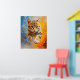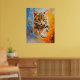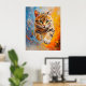 A vibrant digital painting of a Bengal cat mid-leap, showcasing its signature tabby coat and piercing green eyes. The energetic pose is framed by bold abstract brushstrokes in orange and blue, blending realism with artistic flair. This artwork captures motion, personality, and color—perfect for cat lovers and collectors seeking a dynamic feline portrait.
