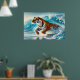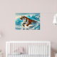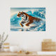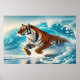Um tigre majestoso de Bengala, irradiando poder e confiança, faz um salto através do oceano superficial, a espuma branca a erupir em torno dele. As listras laranja e negra do tigre se destacam contra o azul vívido da água. A luz cintilante melhora a cena, criando um sentido de movimento e energia. O fundo suave e desfocado do oceano desenhar o olhar do espectador para a poderosa presença do tigre.
