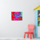 Um design de abstrato de frutas e folhas em cores vibrantes.