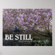 Belo poster religioso com o verso Bíblia "Fique quieto e saiba que sou Deus" de Salmo 46:10 contra um fundo de uma bela foto de flores de cereja rosa e uma lâmpada de gás em uma parede de pedra.