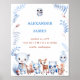 Uma ilustração mágica e esbranquiçada a lápis de animais de floresta encantados (urso, guaxinim, esquilo, coruja, coelho, veado) e a folhagem rústica que decora este poster bebê rapaz que você pode personalizar com o nome do bebê e as estatísticas de nascimento. Azul com sotaques castanhos e arrojados.
