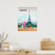 Jovem com um poodle esvoaçando na Torre Eiffel.