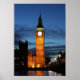 A torre de relógio na extremidade leste do Palácio de Westminster (mais conhecida como as Casas do Parlamento) é vulgarmente conhecida como Big Ben, embora este seja, na verdade, o nome dos sinos que soam a cada quarto de hora. É um ícone mundialmente famoso de Londres, e a área ao redor está sempre ocupada com turistas desfrutando da vista e fotografando a elegante estrutura gota-a-gota. Esta foto é tirada da margem sul, olhando através do rio Tâmisa, ao anoitecer. A iluminação do prédio dá à pedra uma rica tonalidade de ouro e a torre é esboçada contra a azul profunda do céu ao anoitecer.