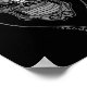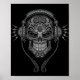Este elaborado design de açúcar do crânio do DJ é decorado com entrelaçados e padrões de pontos. Fones de ouvido sentados em cima do crânio com dois fios pendurados abaixo. Este dia agressivo da imagem inspirada nos mortos é perfeito para músicos e amantes da música.