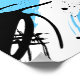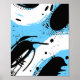This artwork features an abstract composition dominated by bold black ink splashes, dripping shapes, and scattered dots. These elements contrast sharply against a bright blue and white background, creating a dynamic, high-energy visual effect. The design includes irregular forms, spray-paint textures, and comic-style halftone patterns that give it a raw, expressive, and urban feel. The combination of sharp edges, splatters, and fluid black shapes creates a sense of motion and chaotic rhythm throughout the piece.