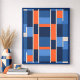 Um desenho abstrato geométrico moderno, composto por retângulos e quadrados adjacentes em azul claro, azul escuro e laranja, separados por linhas de cinza fina e clara. O layout forma linhas horizontais paralelas com uma repetição equilibrada de cores e formas, criando uma aparência visual rítmica e estruturada que lembra uma parede ladrilhada ou um trabalho de arte de mosaico contemporâneo.