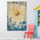 The piece is characterized by its minimalist, bohemian aesthetic, featuring a radiant gold-textured sun with elongated rays set against a backdrop of delicate blue flowers and abstract, weathered textures.