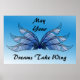 Blue feather art creates wings in center dividing the text "May Your Dreams Take Wing. Background is a Light blue ombre dark to light from the top down.