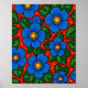 The design features large stylized flowers with rounded petals in rich shades of blue. Each flower has yellow center made of small circular details that add contrast and visual interest. The flowers are surrounded by smooth, pointed green leaves in different tones, giving a fresh and natural feel. The background is filled with a strong red color that enhances the vibrancy of the blue and green elements. Small yellow dots are scattered throughout the design, adding a playful and decorative touch. The overall style is flat, clean, and bold, with clear outlines and strong color harmony.