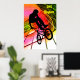 A ação desportiva e a energia dos atletas BMX são capturados em silhuetas de figuras de ação que demonstram truques e acrobacias extremos nas suas bicicletas. As pinturas digitais e ilustrações desses adolescentes e jovens homens incluem fundo de cores brilhantes, vívidas e salpicos de luz para destacar a ação. Eles também se mostram em cenas de rua geladas e escuras onde crianças ganham suas equipes de rua mostrando suas habilidades de bicicleta.