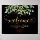 Este sinal de boas-vindas ao casamento preto e dourado apresenta eucalipto verde e folhas verdes e douradas. Para personalização mais avançada deste design, clique no link personalizado