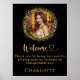 Um poster de boas-vindas para um evento de marco. Um fundo preto clássico decorado com uma imagem falsa dourada brilhante. Personalize e adicione uma foto, texto de boas-vindas, nome. Bem-vindos com o coração.