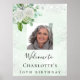 Poster de boas-vindas para uma festa de aniversário 50ª (ou qualquer idade). Personalize e adicione uma foto, um nome e uma idade. Traços de pincel de cor aquosa verde como fundo com poeira brilhante de prata escura, decorada com florais brancos, rosas e verde. Para trás: sem design.