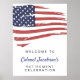 Esta poster de boas-vindas do partido de aposentadoria apresenta uma angustiante bandeira americana e uma simples design neutra. Este sinal pode ser usado para comemorar os primeiros socorristas da polícia, assim como a força marinho ou aérea ou qualquer outro pessoal.